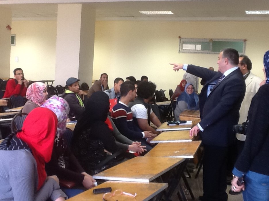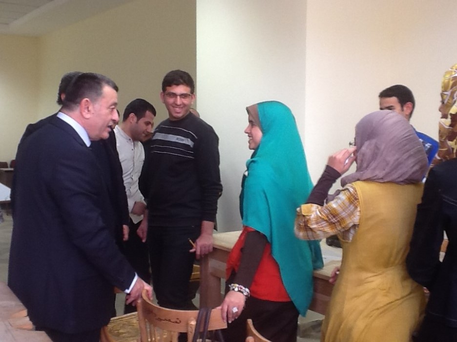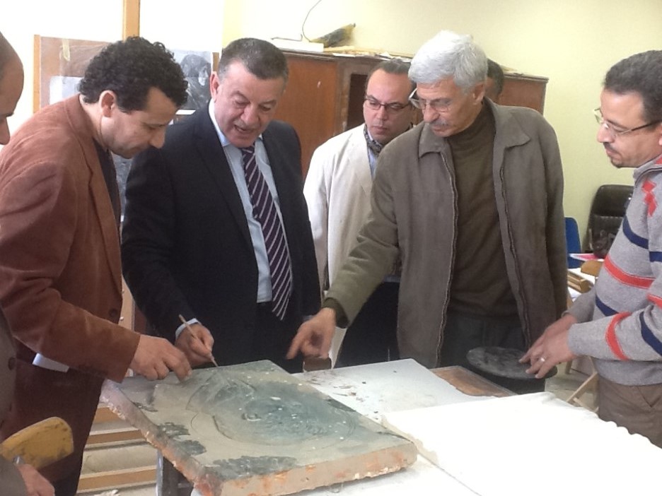 في إطار التواصل مع قيادات الكليات والطلاب مع بدء الفصل الدراسي الثاني قام أ.د/ علي شمس الدين - رئيس الجامعة بزيارة وتفقد أحدث كلية في الجامعة كلية الفنون التطبيقية وقد كان في استقباله أ.د/ ياسر سهيل - عميد الكلية .. وقد إلتقى رئيس الجامعة الطلاب وتحاور معهم عن مشاكلهم من خلال حضور ورشة العمل المقامة بالكلية.