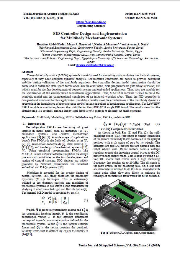 The multibody dynamics (MBDs) approach is mainly used for modelling and simulating mechanical systems, especially if they have complex dynamic analysis. Stabilization controllers are added to provide constraint stability during validation of the multibody equations. For controller design, model linearization should be addressed to obtain the state-space formulation. On the other hand, field-programmable gate arrays (FPGAs) are widely used for the fast development of control systems and embedded applications. Thus, they are suitable for the stabilization of the underactuated mechatronic applications. Thus, MATLAB software is used to build the symbolic model and the computational simulation of an inverted wheeled robot. Then, the PID controller is designed and simulated for this application. Simulation results show the effectiveness of the multibody dynamics approach in the formulation of the state space model-based controllers of mechatronic applications. The LabVIEW FPGA module is used to implement the controller on the sbRIO 9631 single RIO board. The results show that the settling time is 2 seconds, and the steady-state error is ±0.5 degrees at the zero-tilt angle set point. |