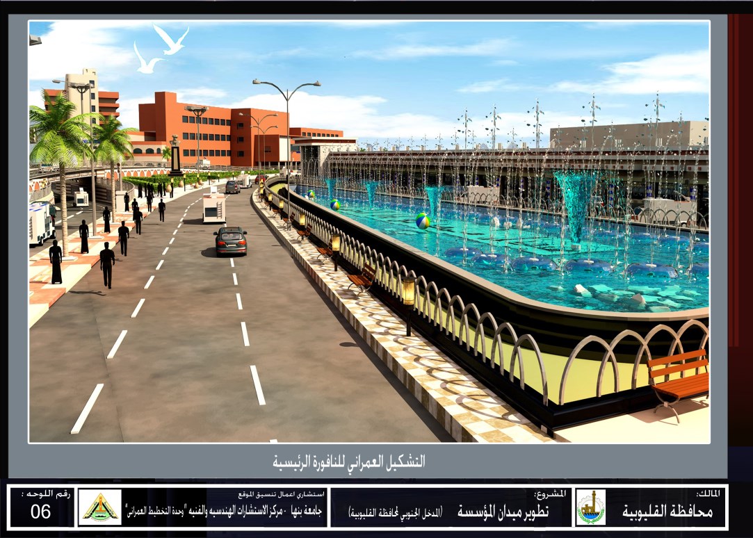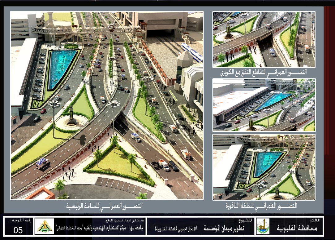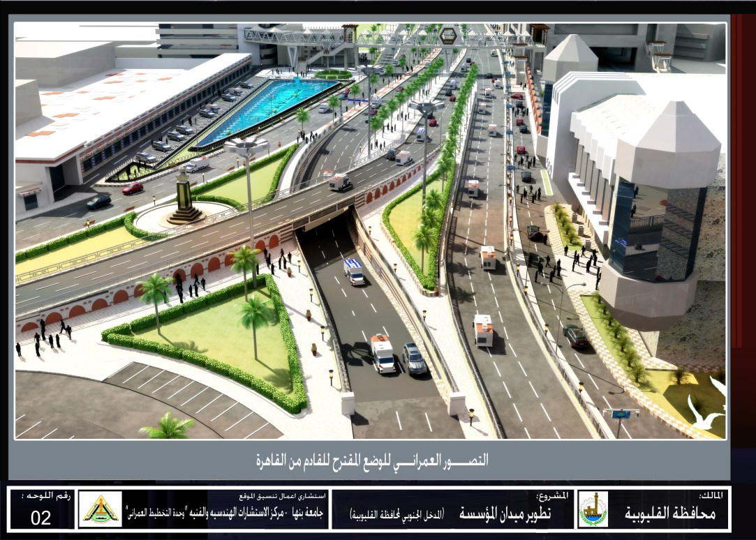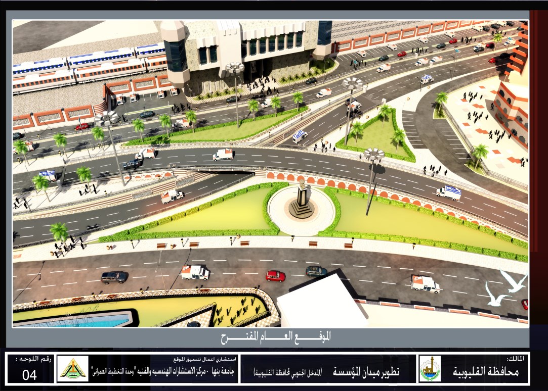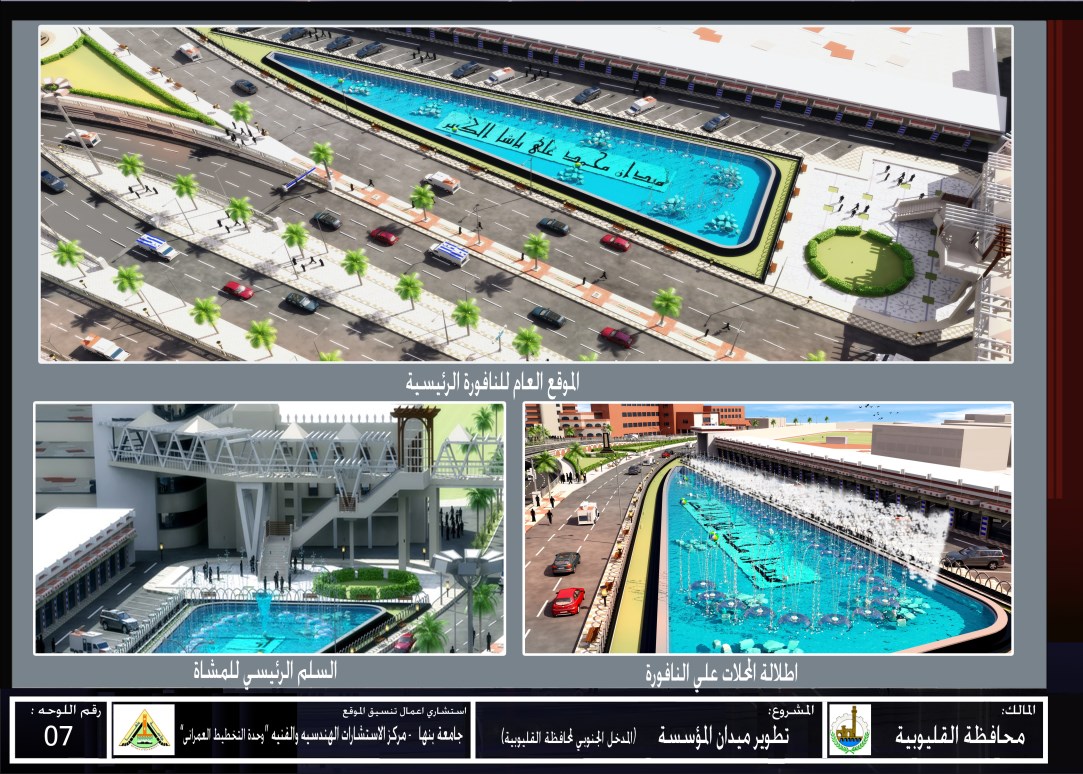 فى إطار التعاون بين جامعة بنها ومحافظة القليوبية وتحت رعاية المهندس/ محمد عبد الظاهر - محافظ القليوبية والأستاذ الدكتور/ علي شمس الدين - رئيس جامعة بنها، قامت الجامعة من خلال وحدة التخطيط العمرانى بمركز الإستشارات الفنية والهندسية - بالإشتراك كإستشارى لأعمال تنسيق الموقع والتجميل لمشروع تطوير ميدان المؤسسة لما له من أهمية إستراتيجية حيث يعتبر المدخل الشمالى للقاهرة وحلقة الاتصال المباشر ما بين محافظتى القليوبية والقاهرة ويهدف المشروع الى عمل تصميم عمرانى متميز لهذا الميدان يساعد على حل كافة المشاكل المرورية وأيضا يكون بمثابة علامة بصرية متميزه كمدخل رئيسى للقادم من القليوبية الى القاهرة وكذلك العكس.