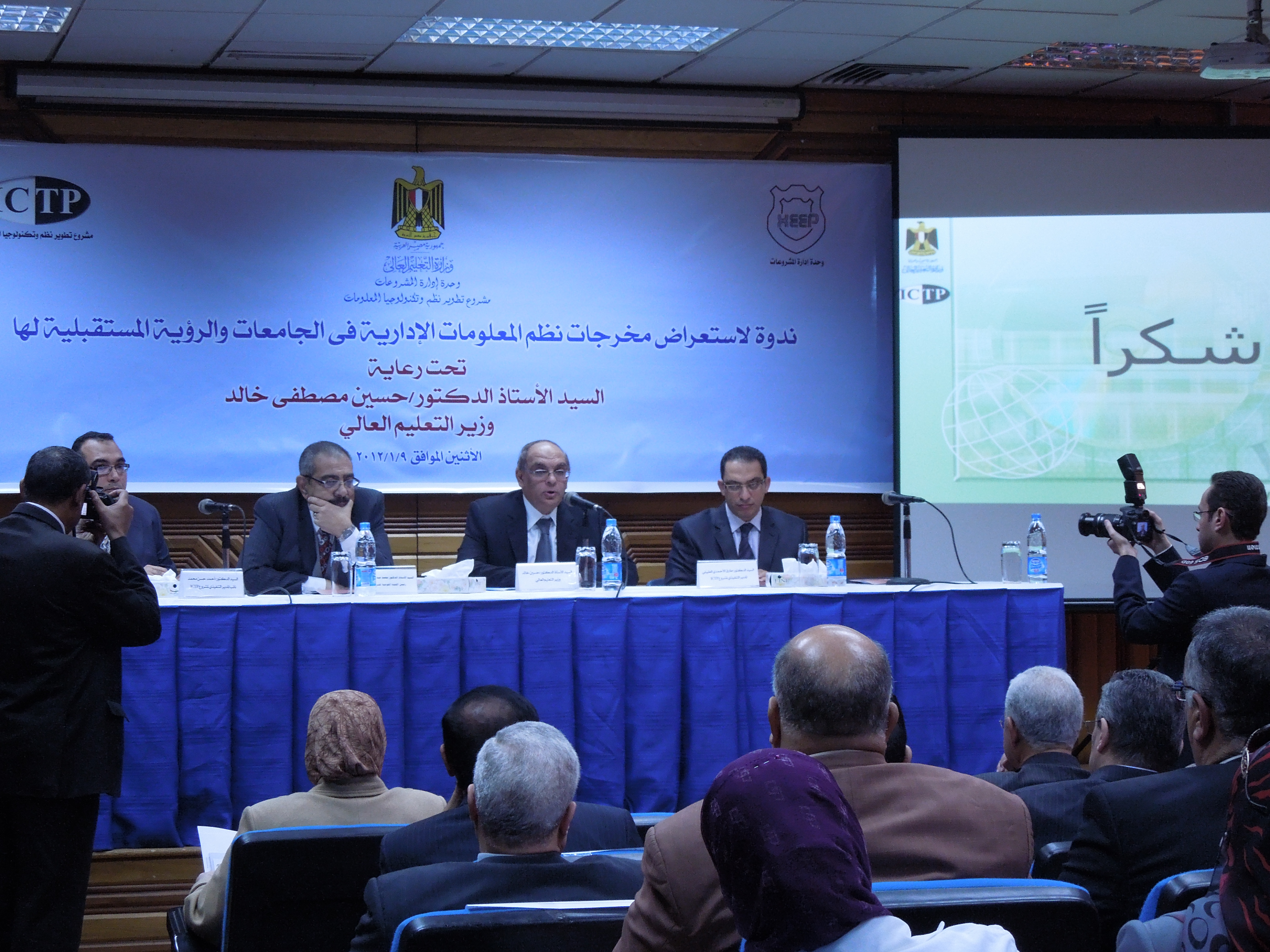 برعاية السيد أ.د/ حسين مصطفى السيد وزير التعليم العالى أقيمت ندوة لإستعراض مخرجات نظم المعلومات الإدارية فى الجامعات والرؤية المستقبلية لها وذلك فى تمام الساعة 10 ص يوم الإثنين الموافق 9/1/2012م
