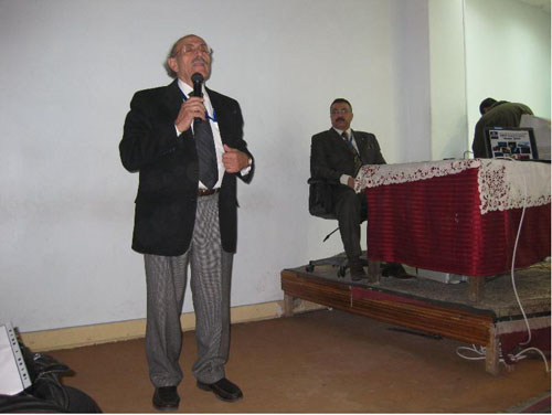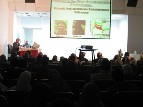 (الأستاذ بجامعة أطلنطا – جورجيا - الولايات المتحدة الأمريكية) حيث ألقى سيادتة محاضرة إستعرض فيها أحدث الأبحاث التطبيقية في مجال النانو تكنولوجي في علاج الخلايا السرطانية وكذالك في مجال الخلايا الشمسية).